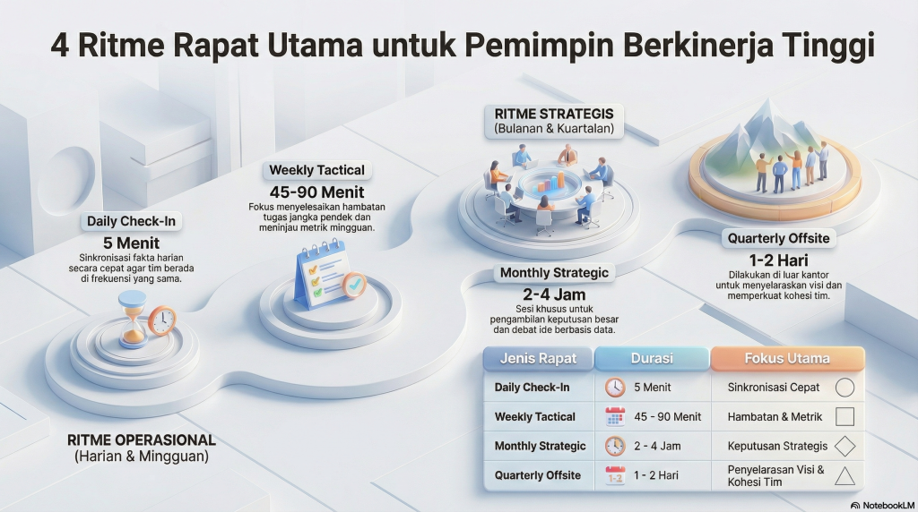 Banyak pemimpin mengeluh karena waktunya habis tersedot rapat. Padahal, masalahnya seringkali bukan pada jumlah rapatnya, tapi pada jenis rapat yang tidak terstruktur. Untuk menjaga ritme kerja yang sehat dan produktif, ada empat jenis rapat utama yang perlu diterapkan oleh setiap pemimpin: